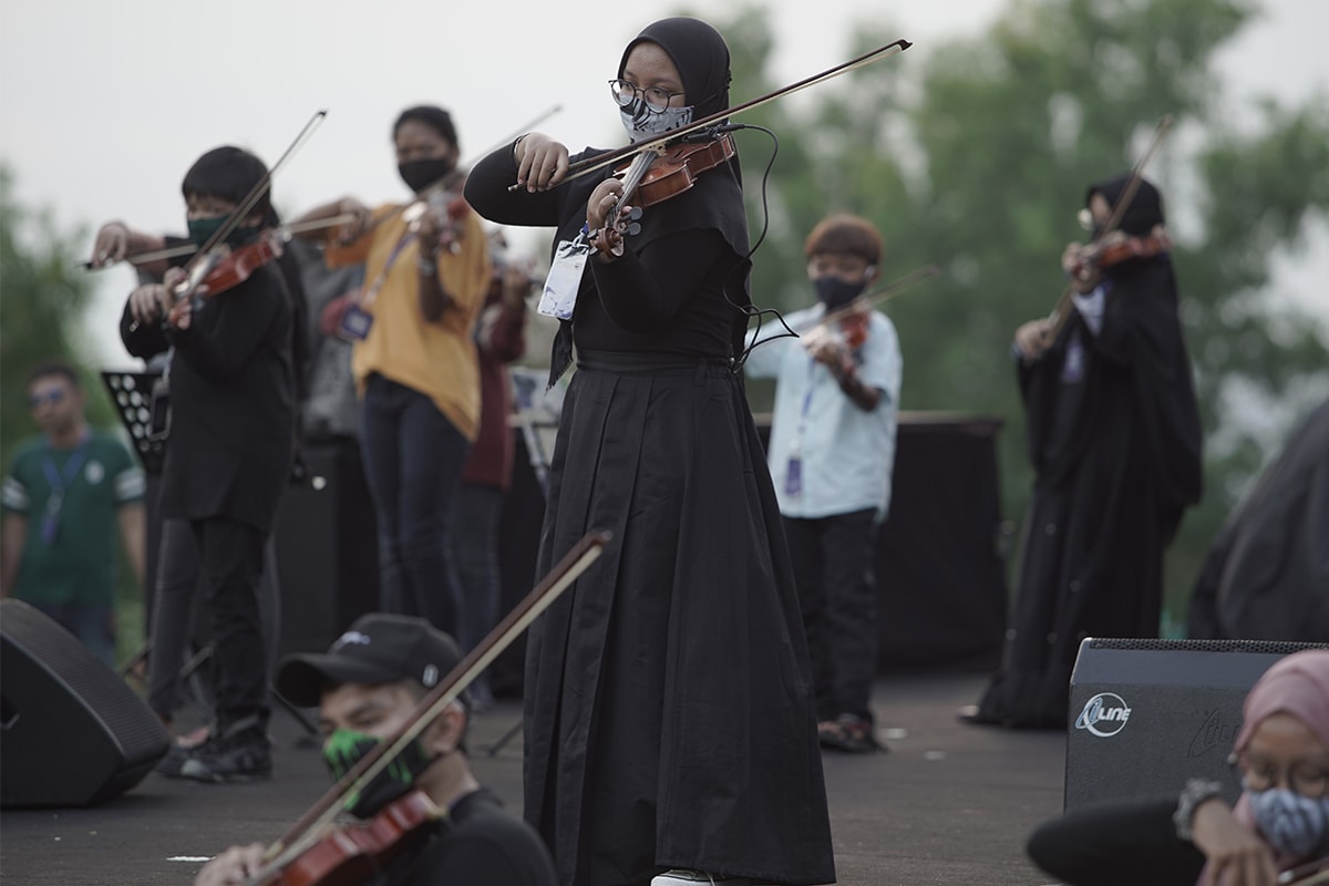 Pada 18 Agustus 2021 lalu ada sebuah perhelatan megah di Monumen Jogja Kembali lho yakni Jogja Violin Fest 2021. Event musik yang diinisiasi oleh Komunitas Biola Jogja ini nggak cuma menyuguhkan permainan apik para pemain biola. Ada pementasan dengan konsep musin on orchestra dengan tajuk Bumi Andaru. Pentas ini menampilkan seni tari, seni musik, dan teater. Wah, keren banget!